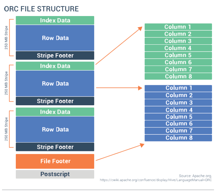 ORC: organizationORC stores collections of rows in one file. Within the collection, row data is stored in a columnar format